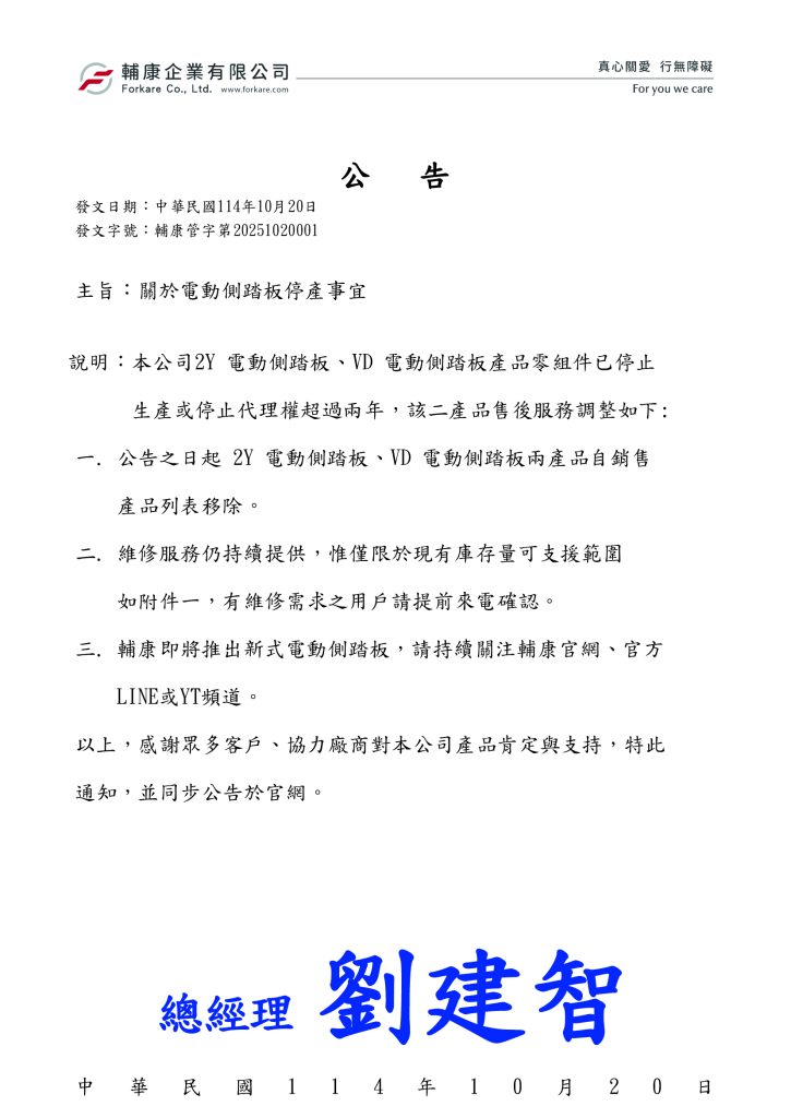 關於本公司 2Y 電動側踏板、VD 電動側踏板停產及售後服務調整之公告。