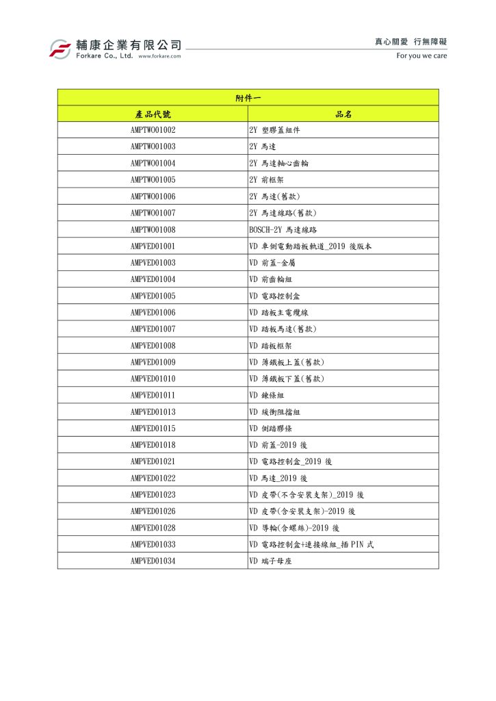 因 2Y 電動側踏板、VD 電動側踏板之關鍵零組件已停止生產或代理權已中止超過兩年,爰自公告日起調整如下: